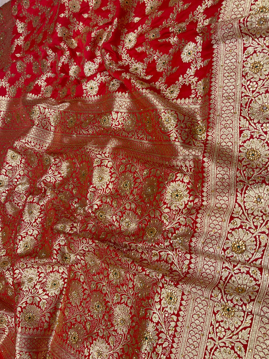 Faishana Presents Red Stone Work Golden Zari Mina Floral Booti Jaal with Paisley Mina Pallu Zari Border and Red Blouse Banarasi Saree
