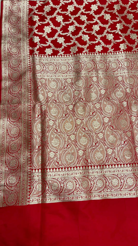 Faishana Presents Red Satin Silk Floral Zari Jaal Low Stone Work Banarasi Saree with Floral Zari Jaal Pallu and Red Blouse