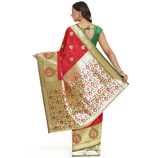 Faishana Presents Red Satin Silk Mughal Motif Zari Boota Paithani Anchal Skirt Border Green Blouse Banarasi Saree