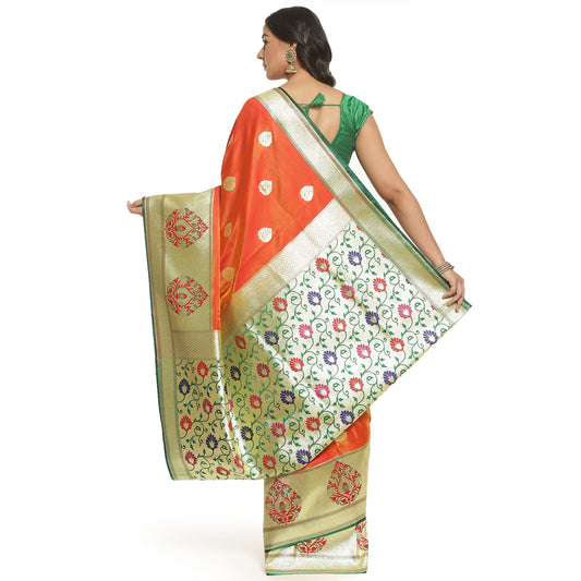 Faishana Presents Orange Satin Silk Zari Boota Paithani Anchal Skirt Border with Green Blouse Banarasi Saree
