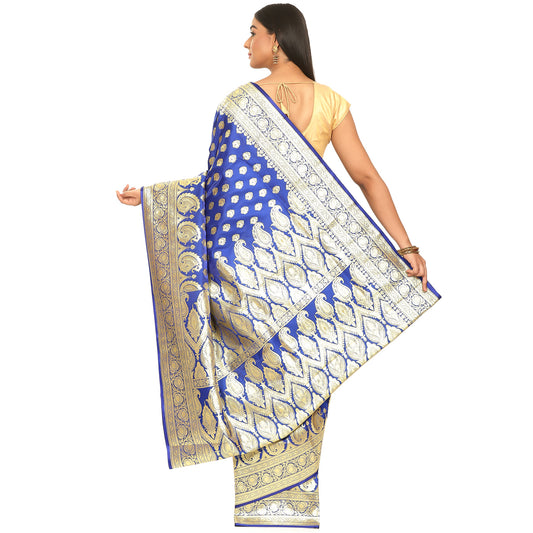 Faishana Presents Royal Blue Satin Silk Mughal Motif Zari Booti With Skirt Border and Blue Blouse Banarasi Saree