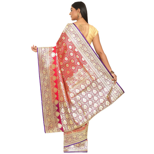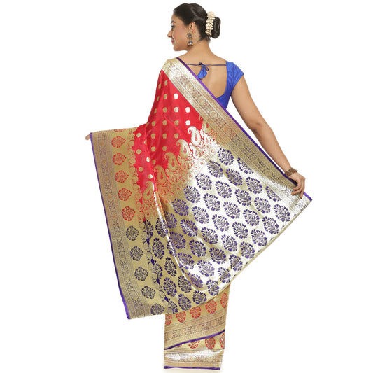 Faishana Presents Red Satin Silk Mughal Motif Zari Jaal Boota with Contrast Blue Blouse Banarasi Saree