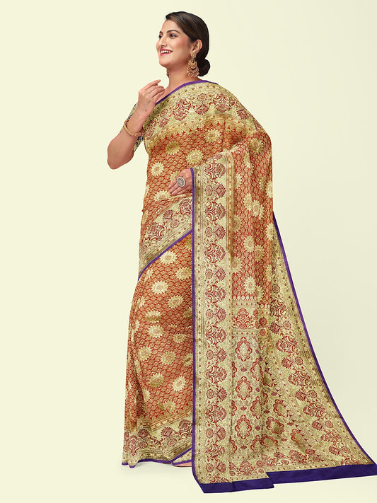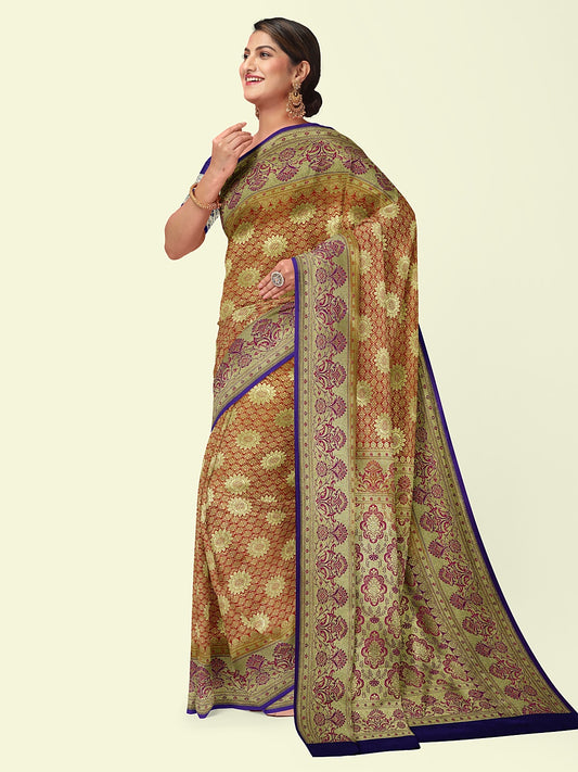 Faishana Presents Orange Satin Silk Mughal Motif Zari Boota Jaal with Contrast Blue Blouse Banarasi Saree