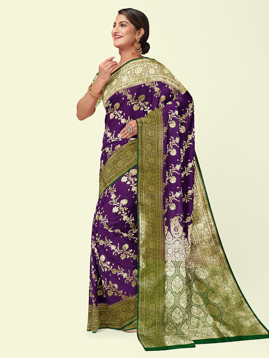 Faishana Presents Purple Satin Silk Diagonal Zari Jaal Kadiyal Green Border & Pallu With Green Blouse Banarasi Saree
