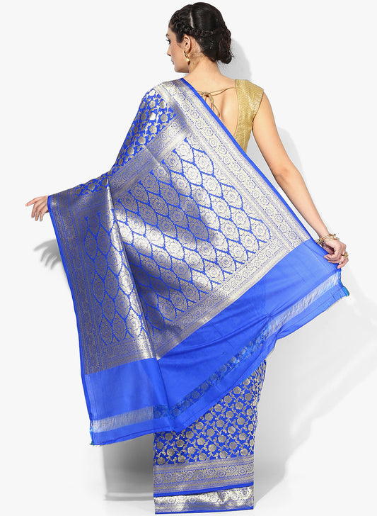 Faishana Presents Blue Satin Silk Zari Jaal Banarasi Border with Matching Blue Blouse Saree