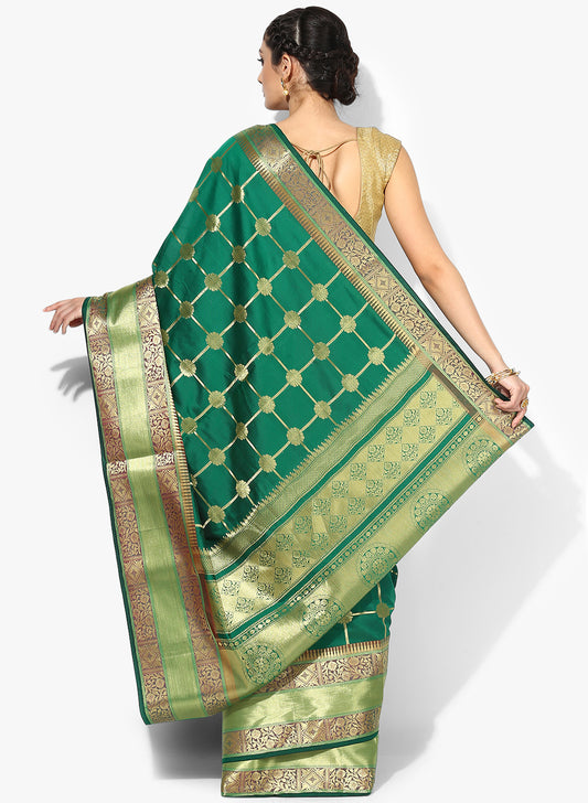 Faishana Presents Green Satin Silk Floral Zari Stripe Checkered Banarasi Saree