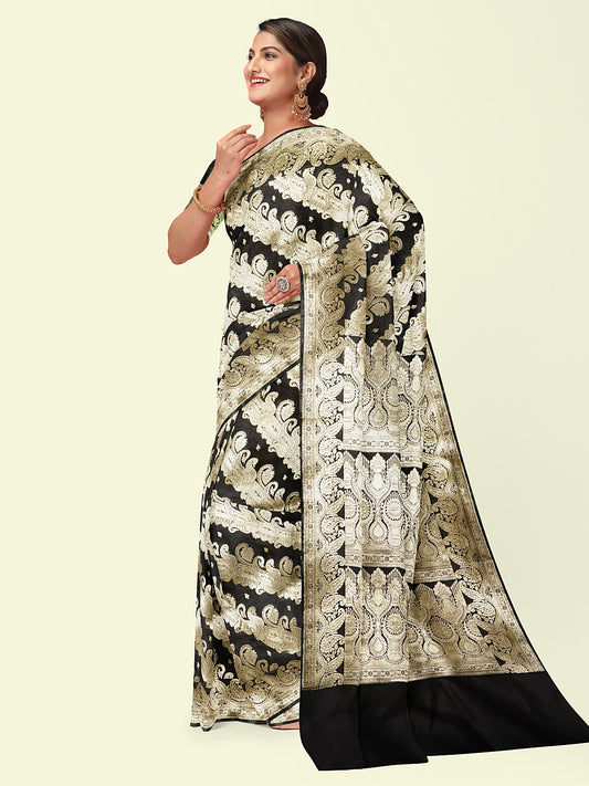 Faishana Presents Black Satin Silk Daigonal Zari Jaal With Black Blouse Banarasi Saree