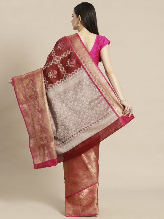 Faishana Presents Maroon & Pink Ikkat Patola Art Silk Kanchi Pattu Border With Pink Blouse Banarasi Saree