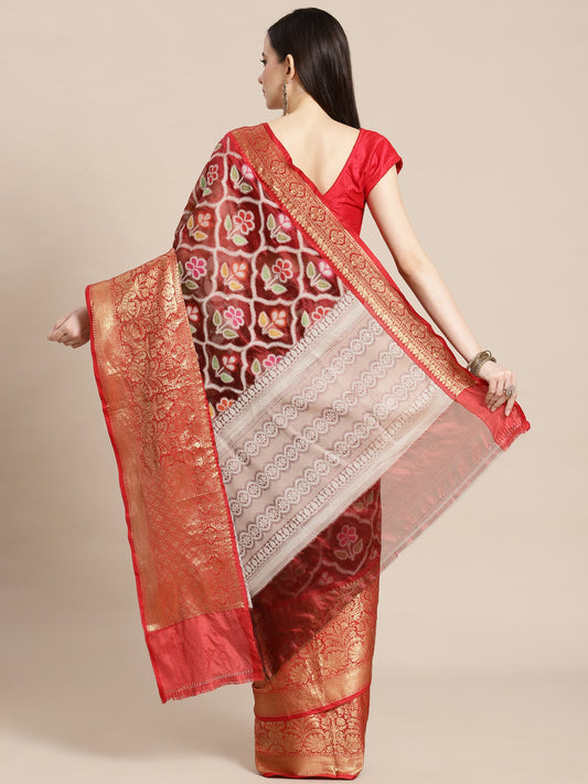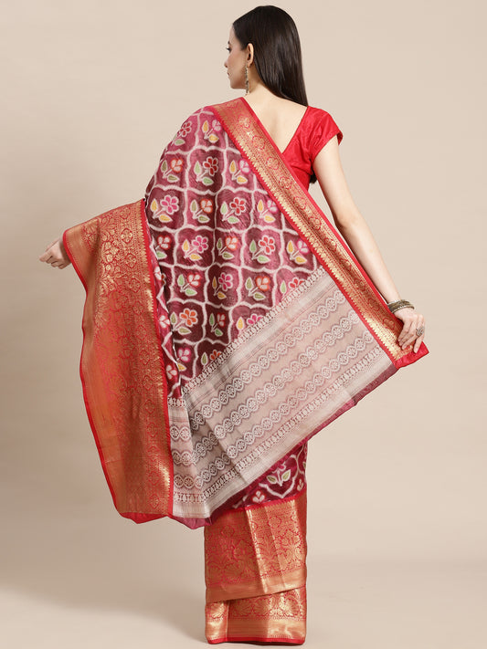 Faishana Presents Maroon & Red Ikkat Patola Art Silk Kanchi Pattu Border With Red Blouse Banarasi Saree