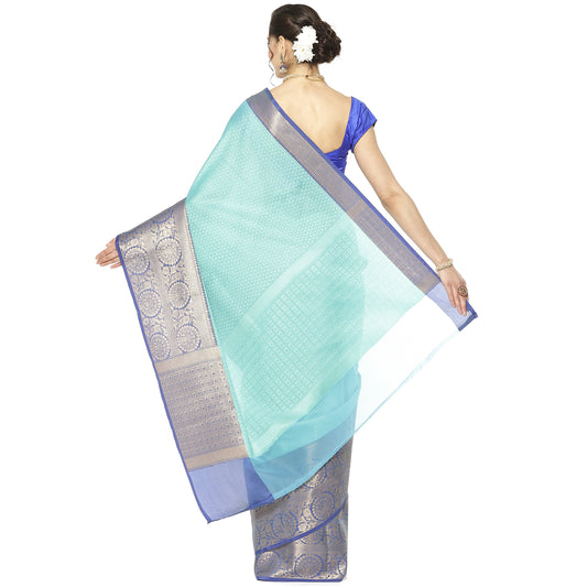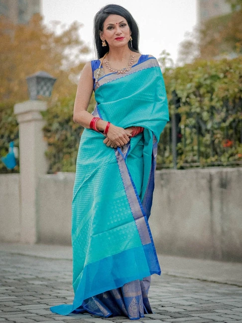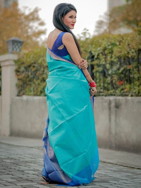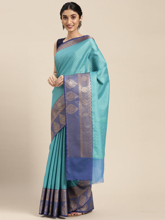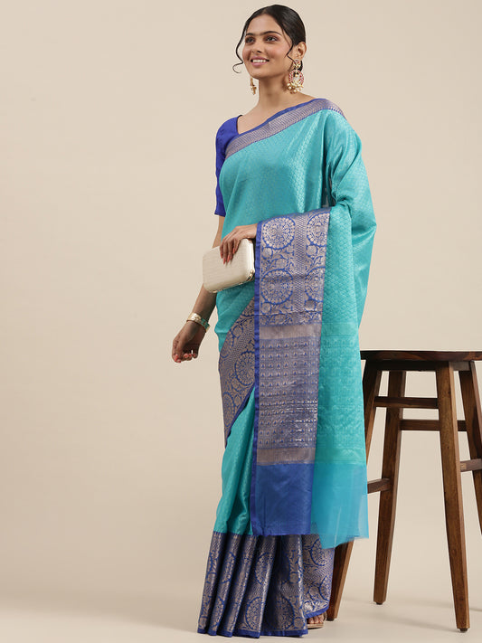 Faishana Turquoise Blue Resham Brocade Saree With Contrast Blue Zari Pattu Border