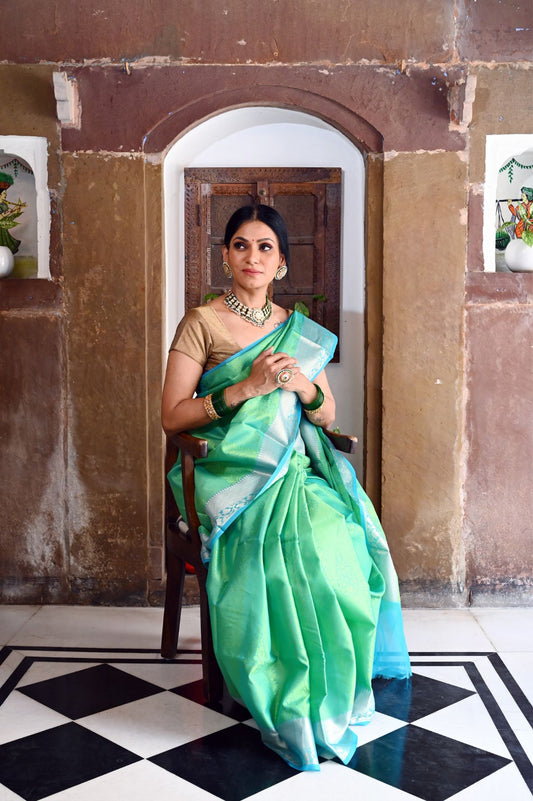 Faishana Presents Green Resham Brocade Contrast Turquoise Blue Zari Pattu Border Banarasi Saree