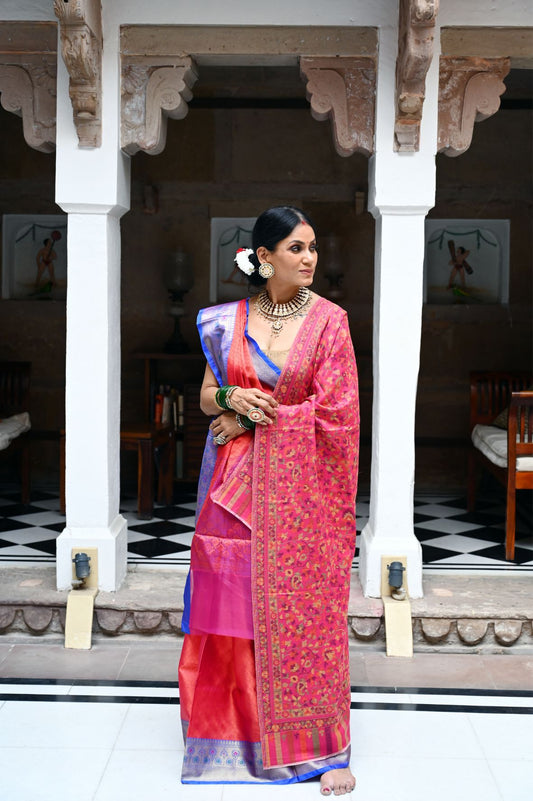 Faishana Light Red Resham Brocade Saree With Contrast Blue Zari Pattu Border