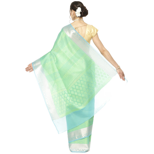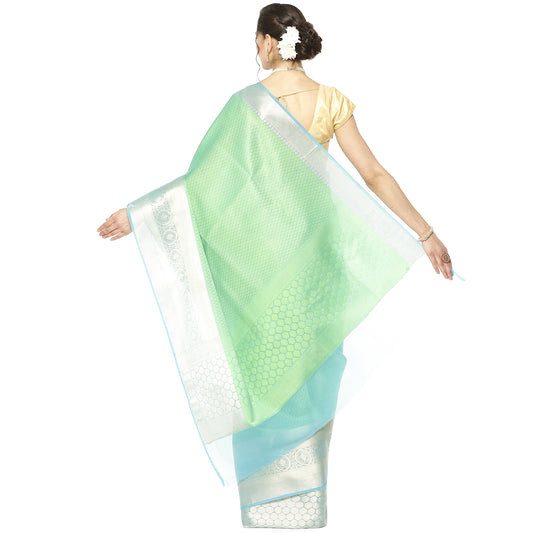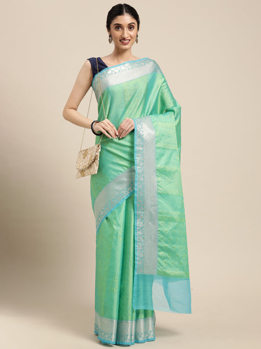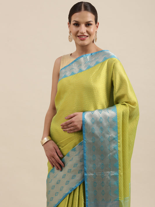 Faishana Green Resham Brocade Saree With Contrast Sky Blue Zari Pattu Border