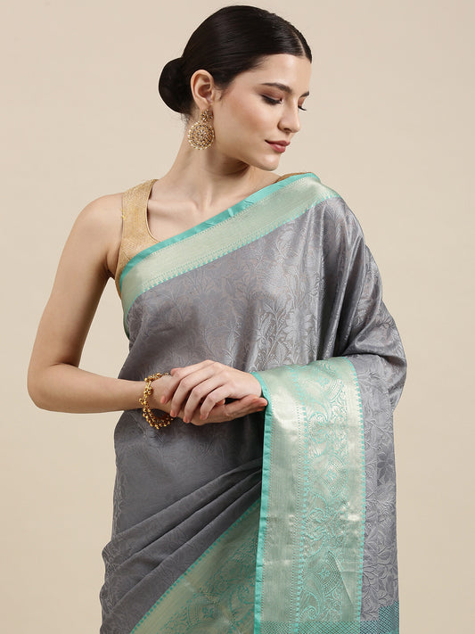 Faishana Grey Resham Brocade Saree With Contrast Seagreen Zari Pattu Border