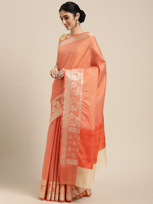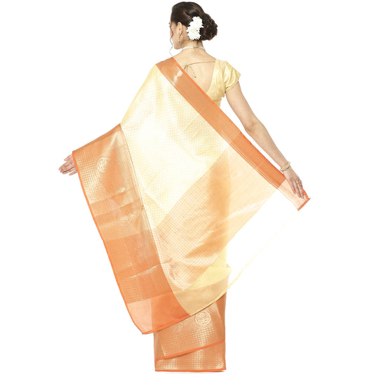 Faishana Cream Resham Brocade Saree With Contrast Orange Zari Pattu Border