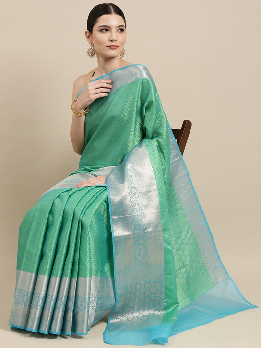 Faishana Green Resham Brocade Saree With Contrast Turquoise Blue Zari Pattu Border