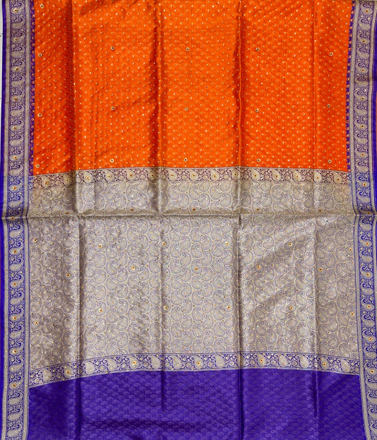 Faishana Presents Orange Tanchoi Silk Low Stone Work with Contrast Blue Pallu Zari Border and Purple Blouse