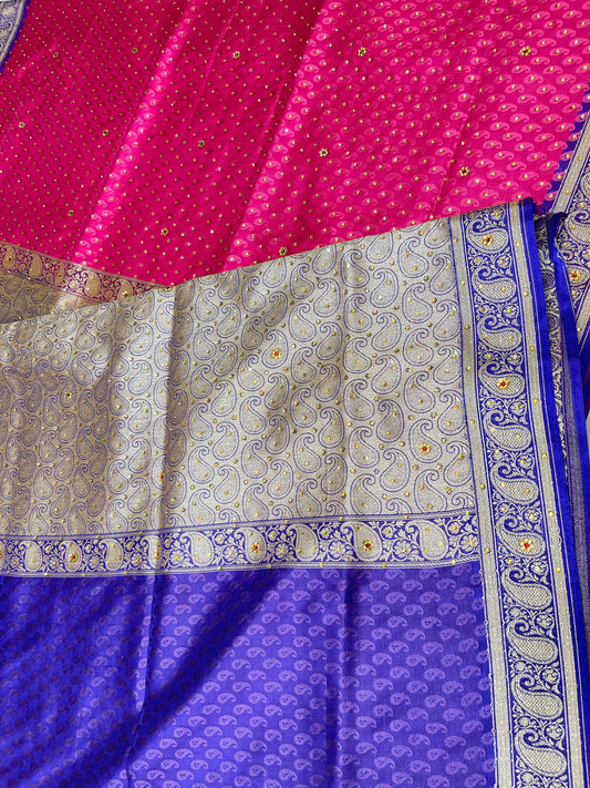 Faishana Presents Turqouise Pink Tanchoi Silk Low Stone Work with Contrast Blue Pallu Zari Border and Purple Blouse