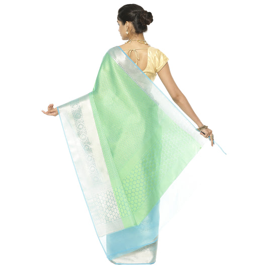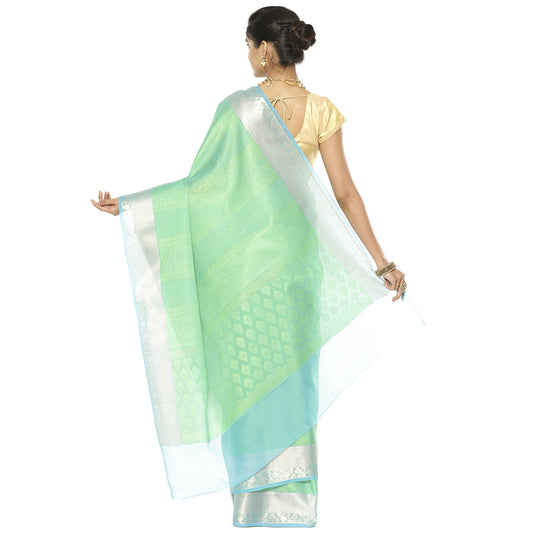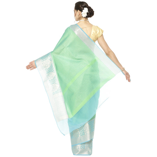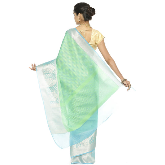 Faishana Green Resham Brocade Saree With Contrast Turquoise Blue Zari Pattu Border