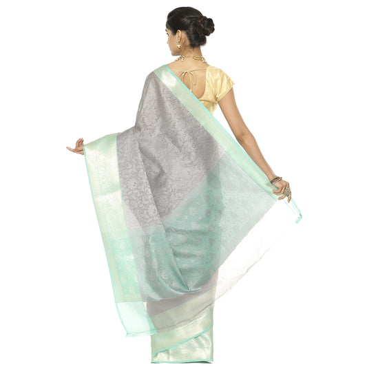 Faishana Grey Resham Brocade Saree With Contrast Seagreen Zari Pattu Border