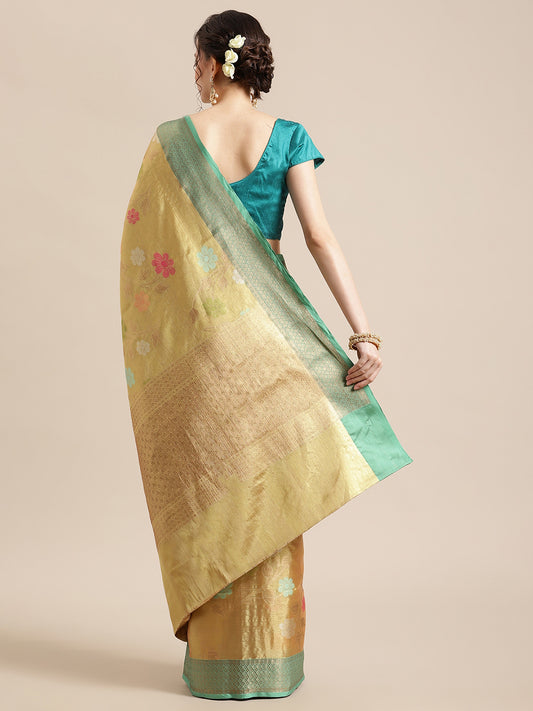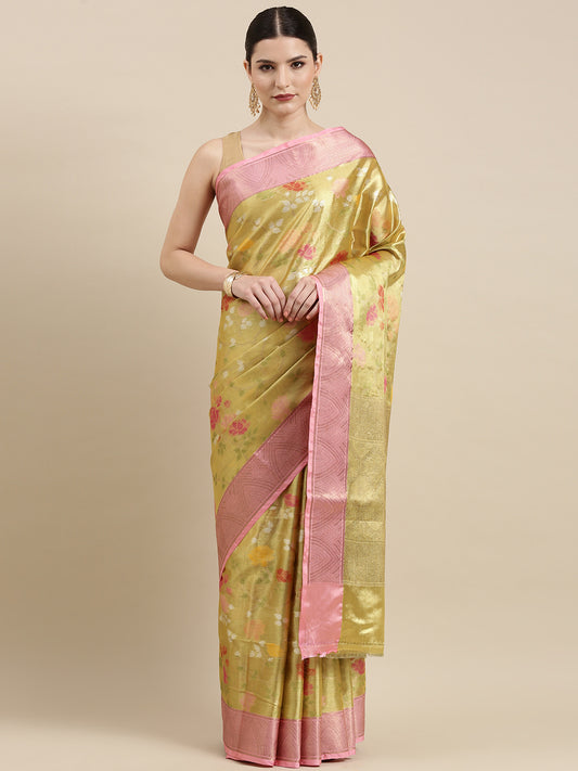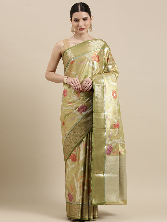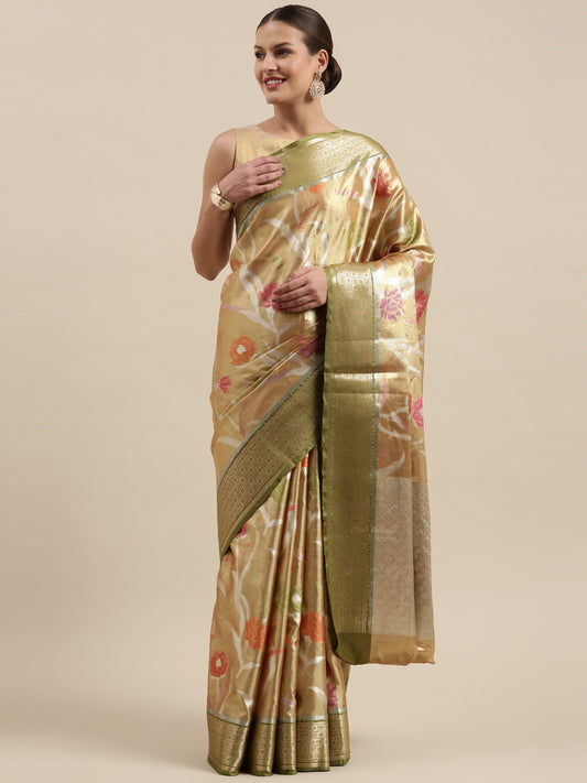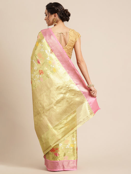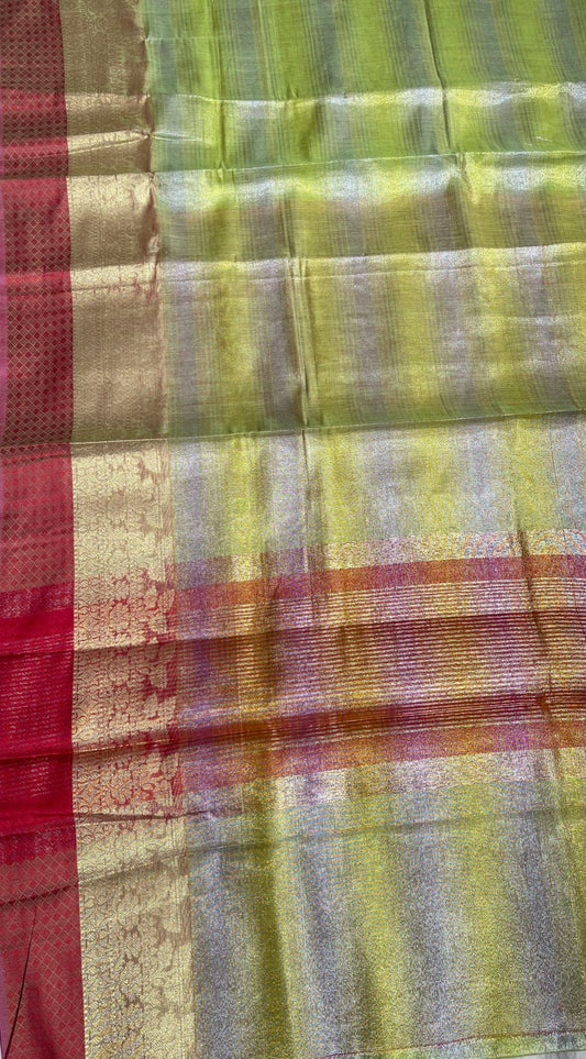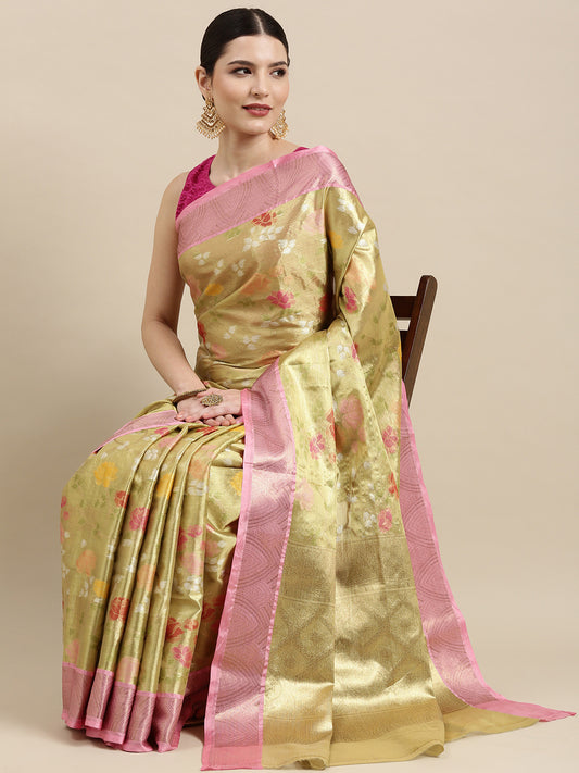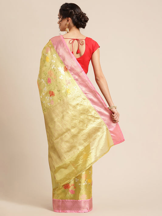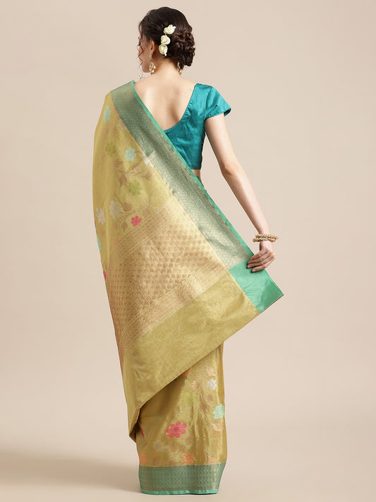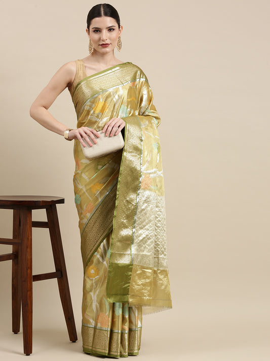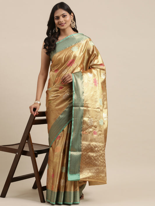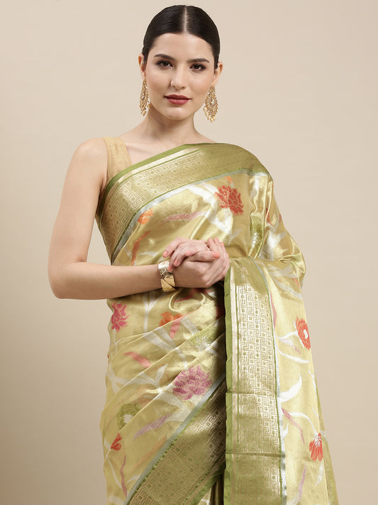 Faishana Presents Gold & Green Tissue Meena Jaal Zari Border With Green Blouse Banarasi Saree