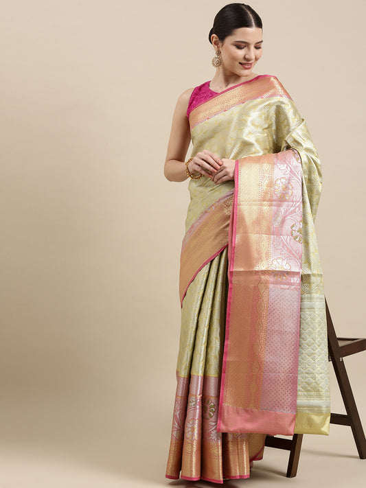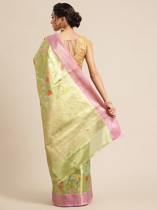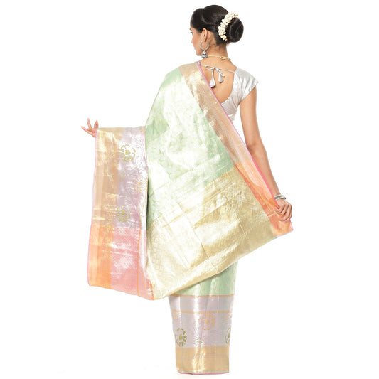 Faishana Presents Pistachio Gold & Pink Tilfi Jamdani Jaal Border with Pista Blouse Banarasi Saree