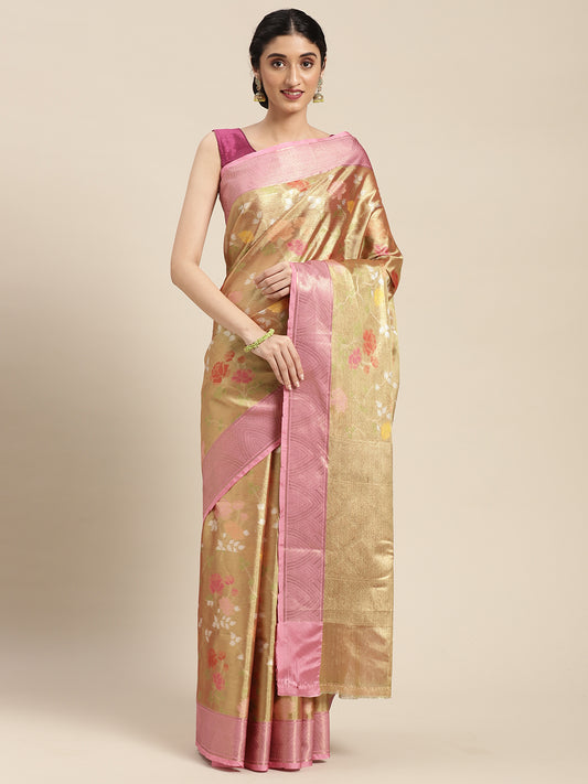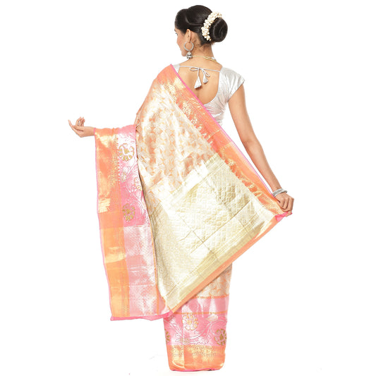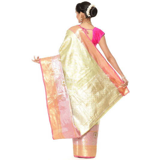 Faishana Presents Pure Gold & Pink Tilfi Jamdani Jaal Border With Gold Blouse Banarasi Saree