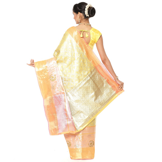 Faishana Presents Lemon Gold & Pink Tilfi Jamdani Jaal Border With Gold Blouse Banarasi Saree