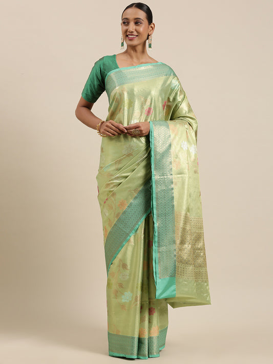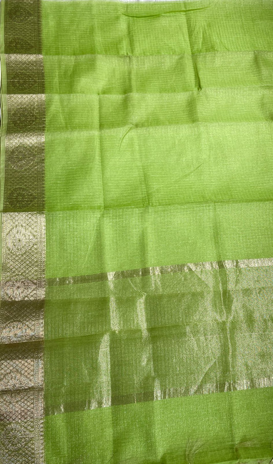 Faishana Presents Pista Green Supernet Banarasi Tissue Silver Zari Stripe and Silver Floral Zari Border with Stripe Pista Green Blouse Banarasi Saree
