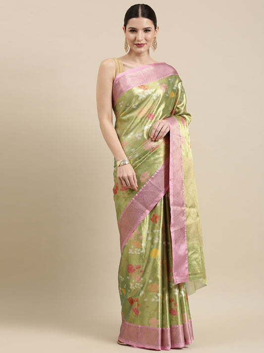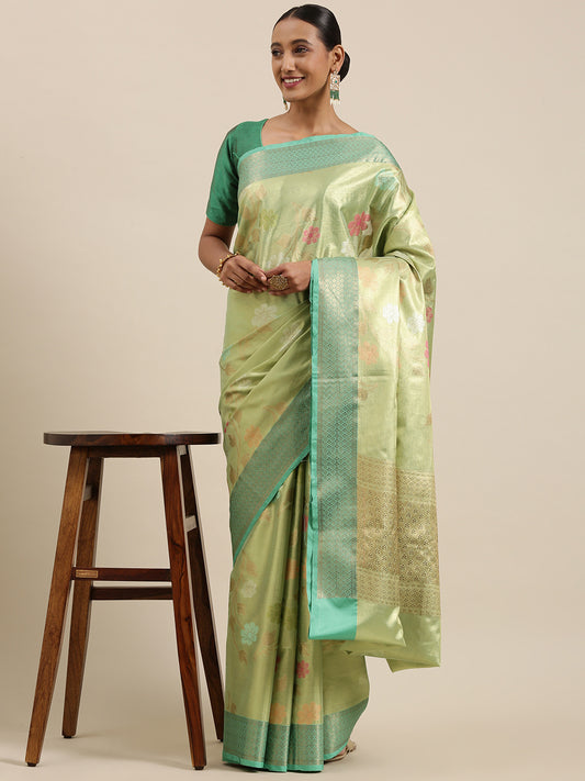 Faishana Presents Pistachio & Green Tissue Meena Jaal Border With Green Blouse Banarasi Saree