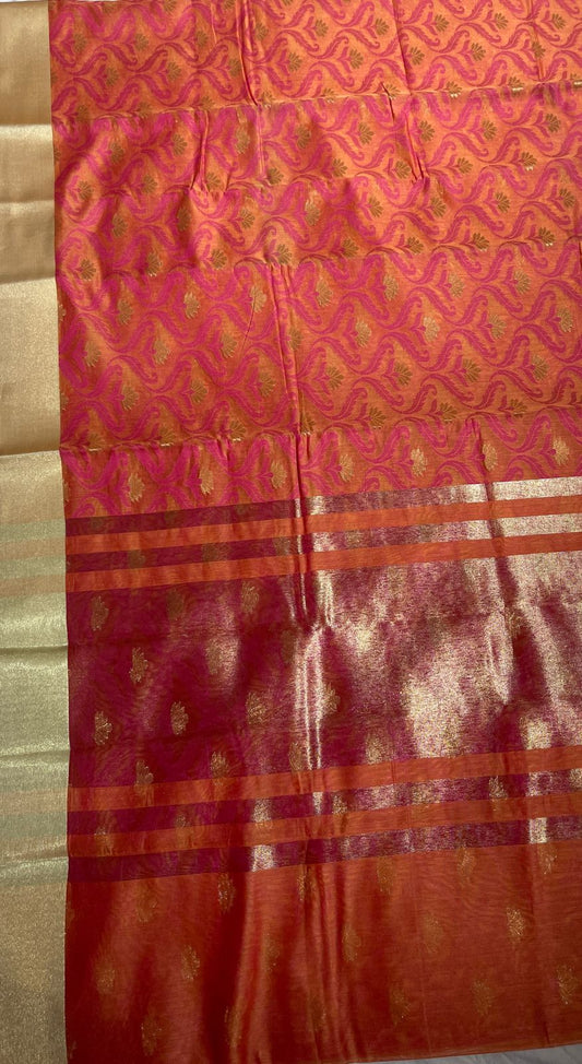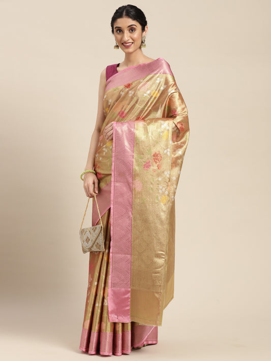 Faishana Presents Antique Gold & Pink Tilfi Jamdani Jaal Border With Gold Blouse Banarasi Saree