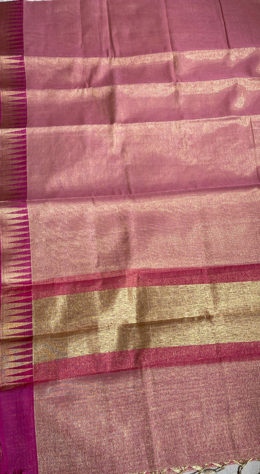 Faishana Presents Peach Kora Tissue Plain and Magenta Gold Zari Border with Stripe Magenta Blouse Banarasi Saree