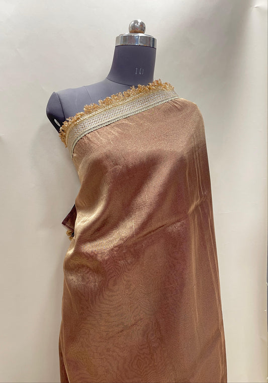 Faishana Presents Brown Plain Tissue Tripple Golden Lace Banarasi Saree with Brown Stripe Blouse.