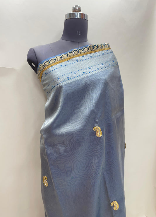 Faishana Presents Blue Lace Work Zardozi Pattern Patch work Saree with jacquard Blouse.
