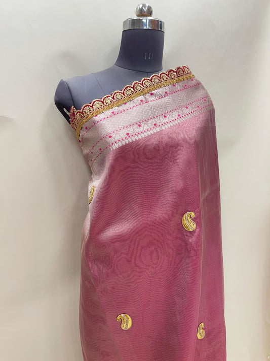 Faishana Presents Pink Lace Work Zardoji Pattern Patch work Saree with jacquard Blouse.