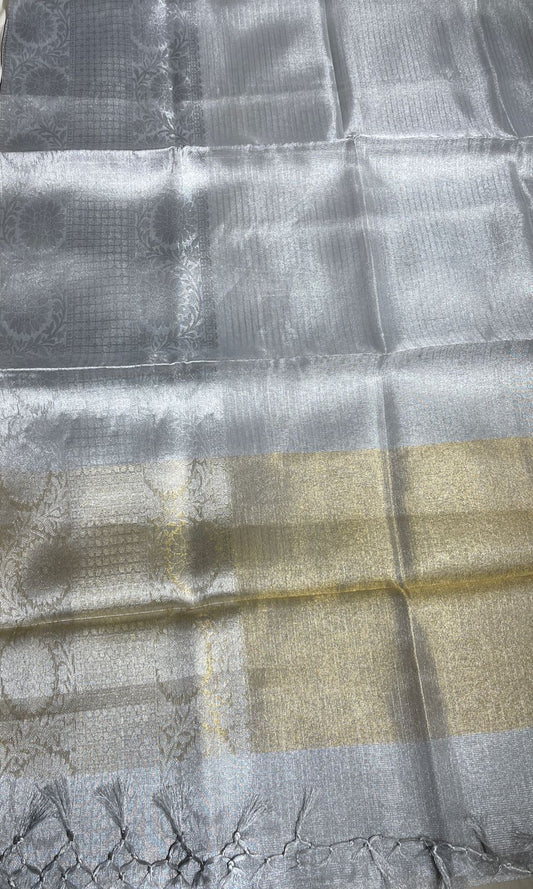 Faishana Presents Silver Supernet Banarasi Tissue Zari Stripe Skirt Floral Zari Border and Contrast Gold Pallu with Silver Blouse Banarasi Saree