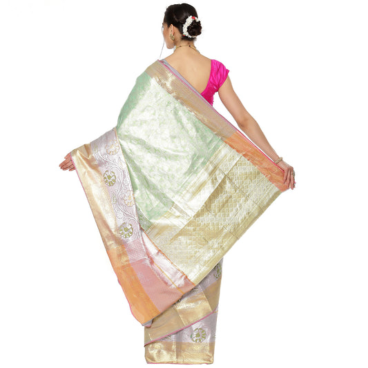 Faishana Presents Pistachio Gold & Seagreen Tissue Meena Jaal Zari Border With Seagreen Blouse Banarasi Saree