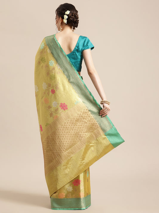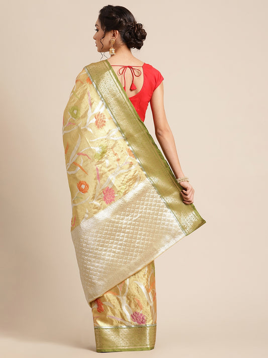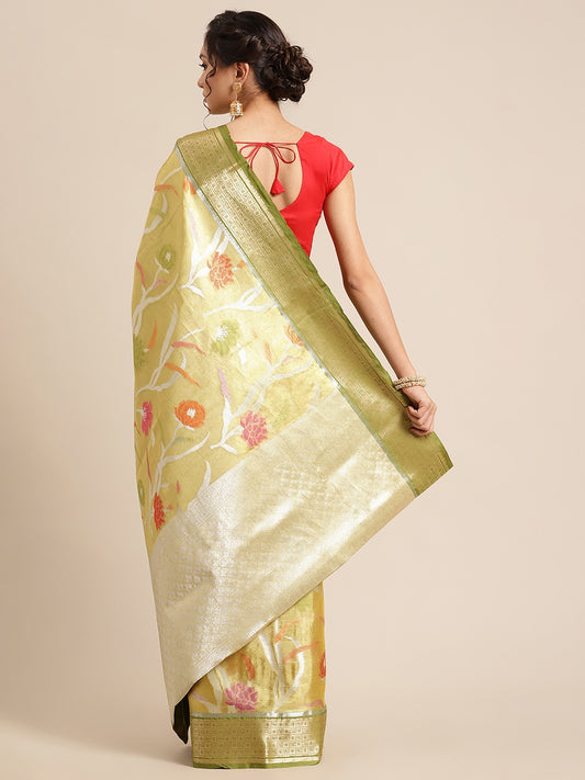 Faishana Presents Gold & Green Tissue Meena Jaal Border With Green Blouse Banarasi Saree