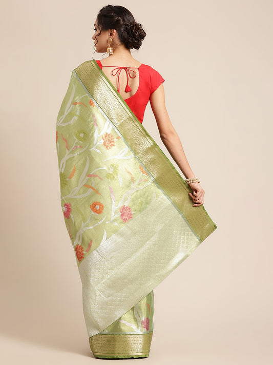 Faishana Presents Pistachio & Green Tissue Meena Jaal Border With Green Blouse Banarasi Saree