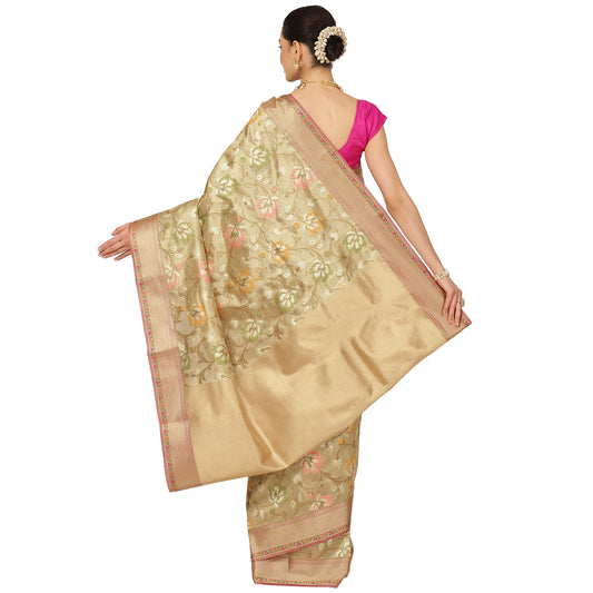 Faishana Presents Beige Tissue Tilfi Jaal Floral Meena Weaving Tilfi Kadiyal Beige Border Banarasi Saree