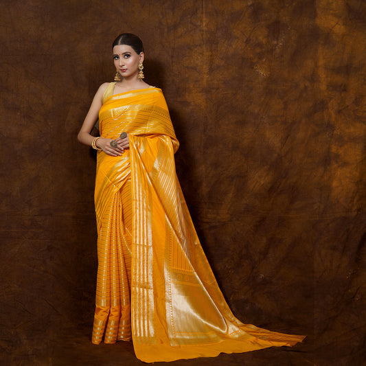 Warm Silk Dark Gold Color Gap Border With Strip Banarasi Gap Border Saree