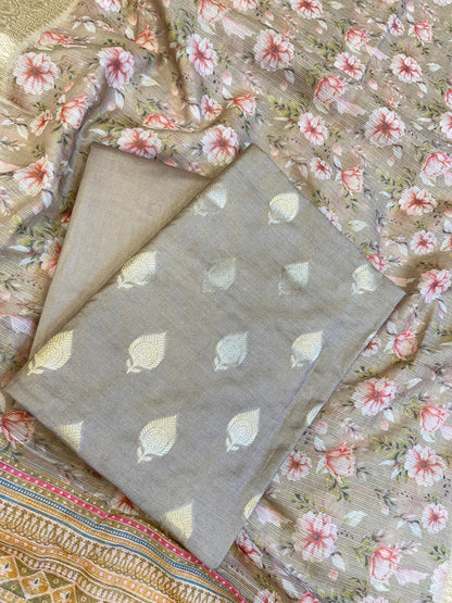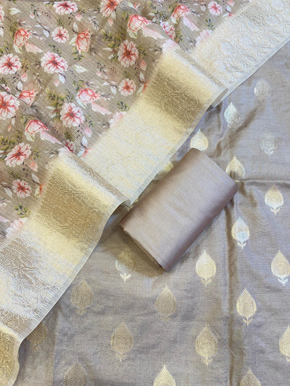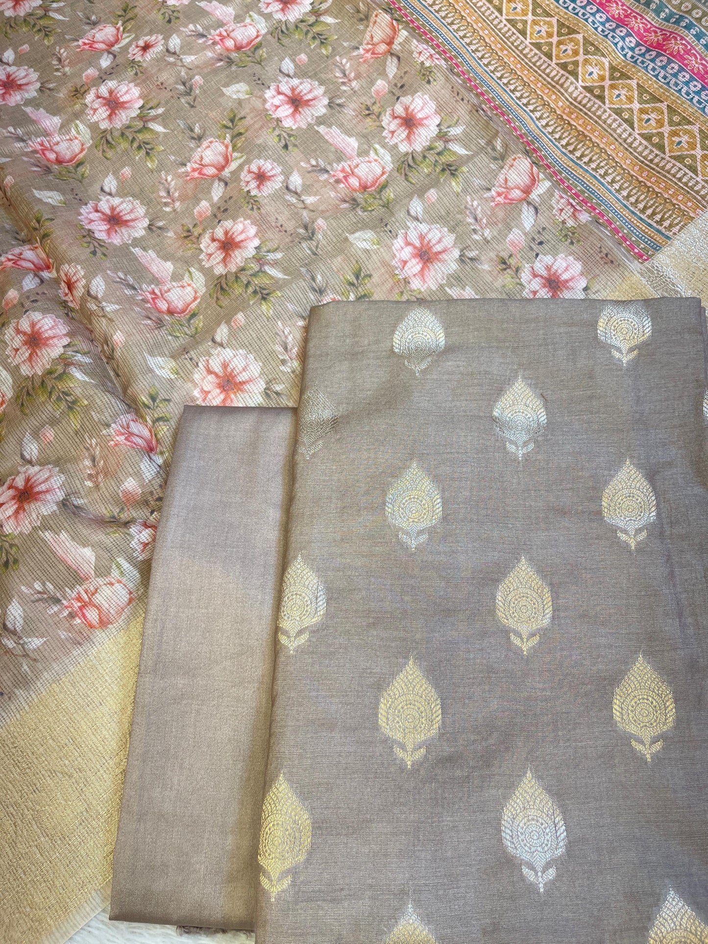 Beige Cotton Silk Dyable Floral Zari Booti with Digital Print Kota Check Dupatta Banarasi 3 pcs Suit Set 11IM_DCS11