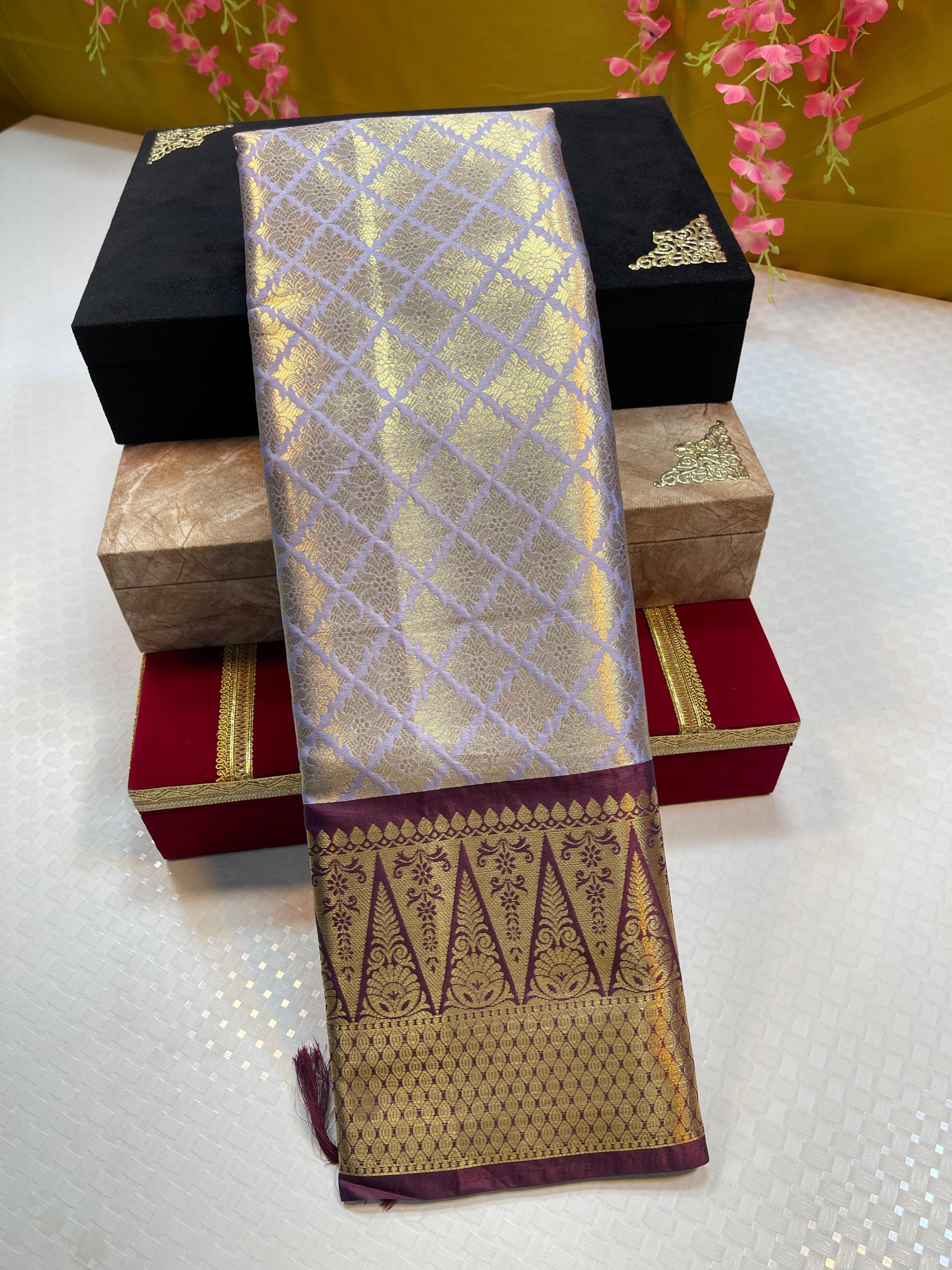 Light Grey Semi Kanchi Silk Brocade Contrast Brown Border Banarasi Saree MS_SK11
