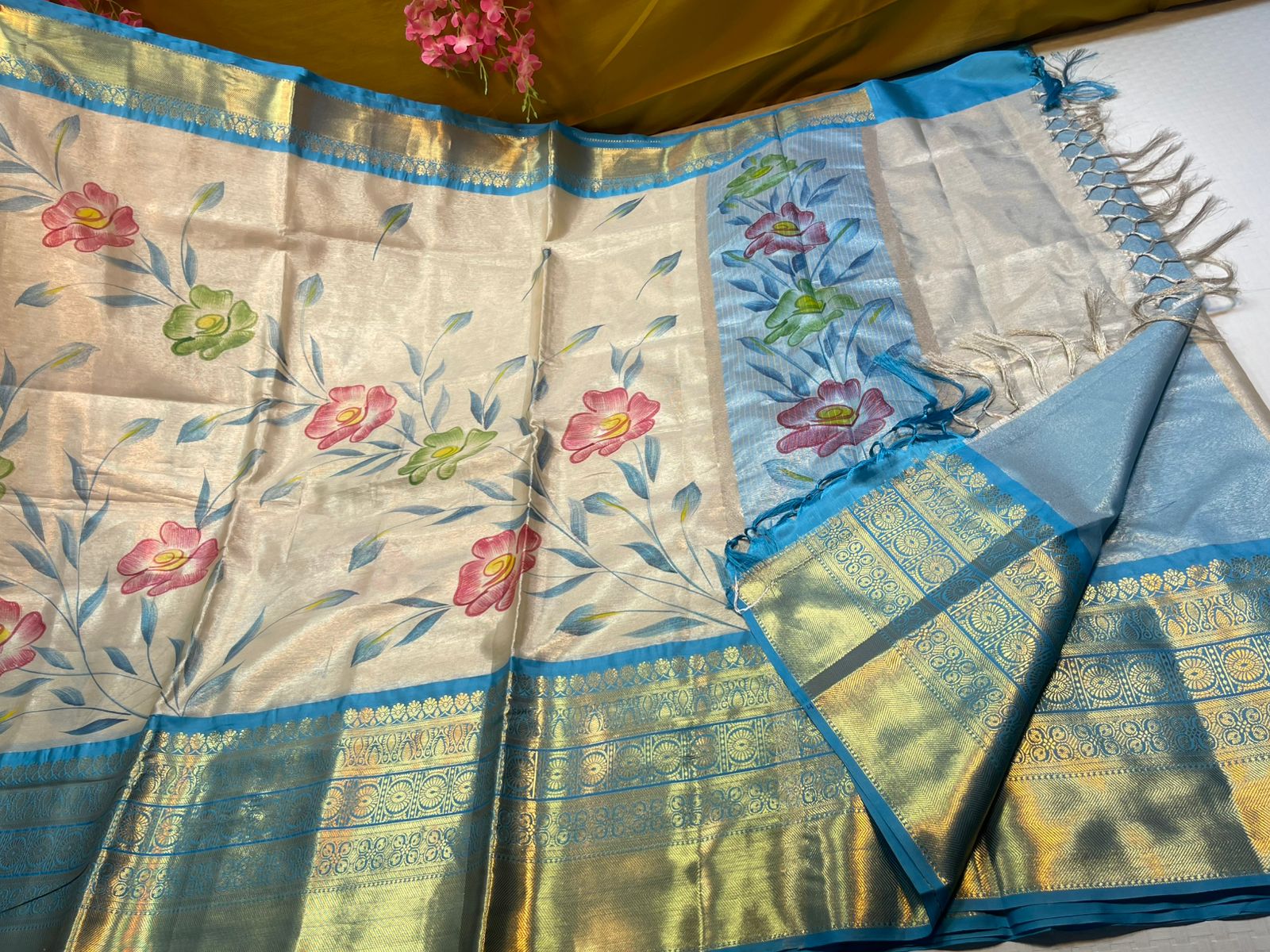 Moosee Tissue Silk Floral Handpainted Jaal Boota Contrast Blue Border Banarasi Saree MS_MTS7