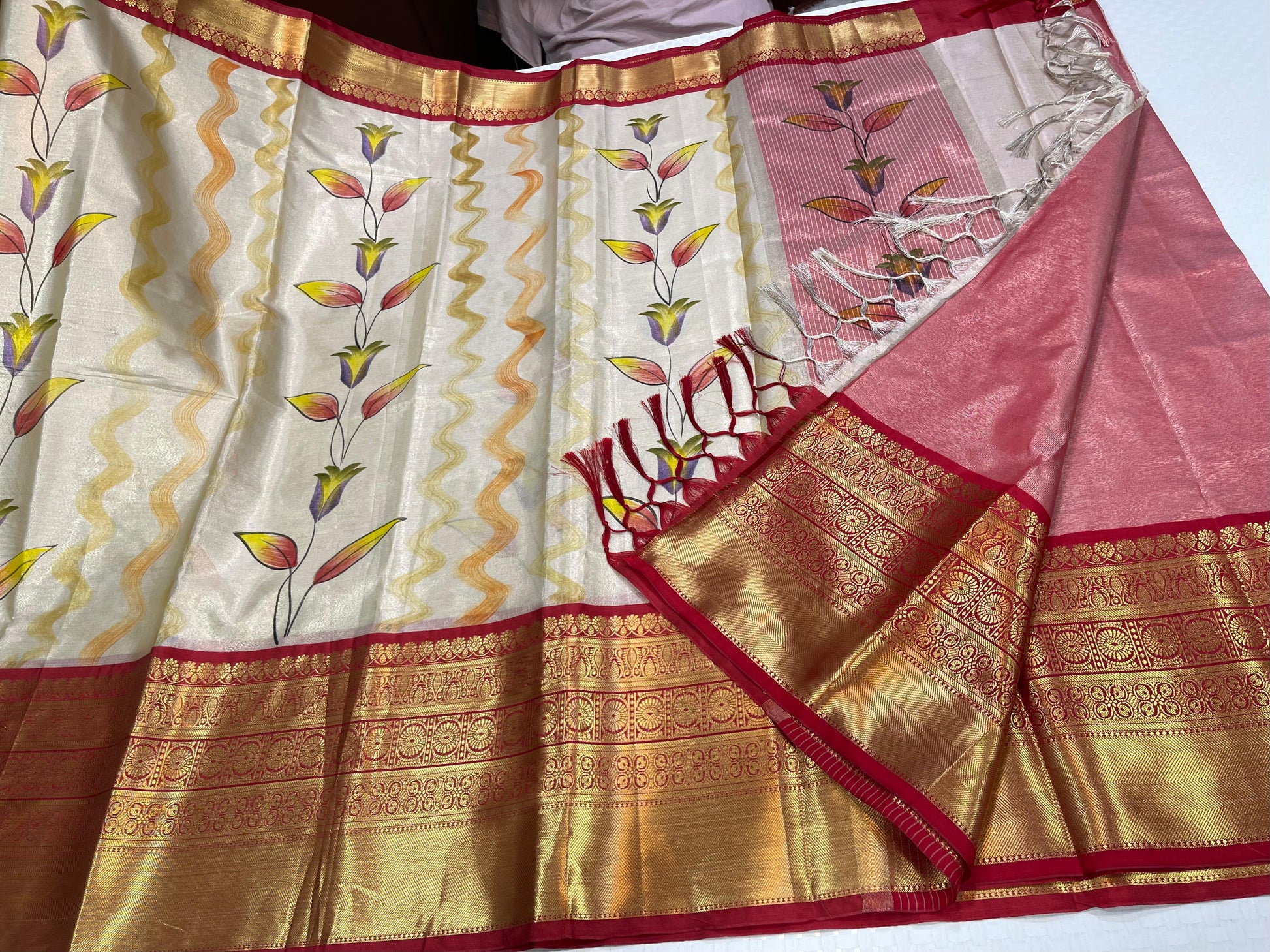 Off white Tissue Silk Floral Handpainted Boota Contrast Red Border Banarasi Saree MS_TS12
