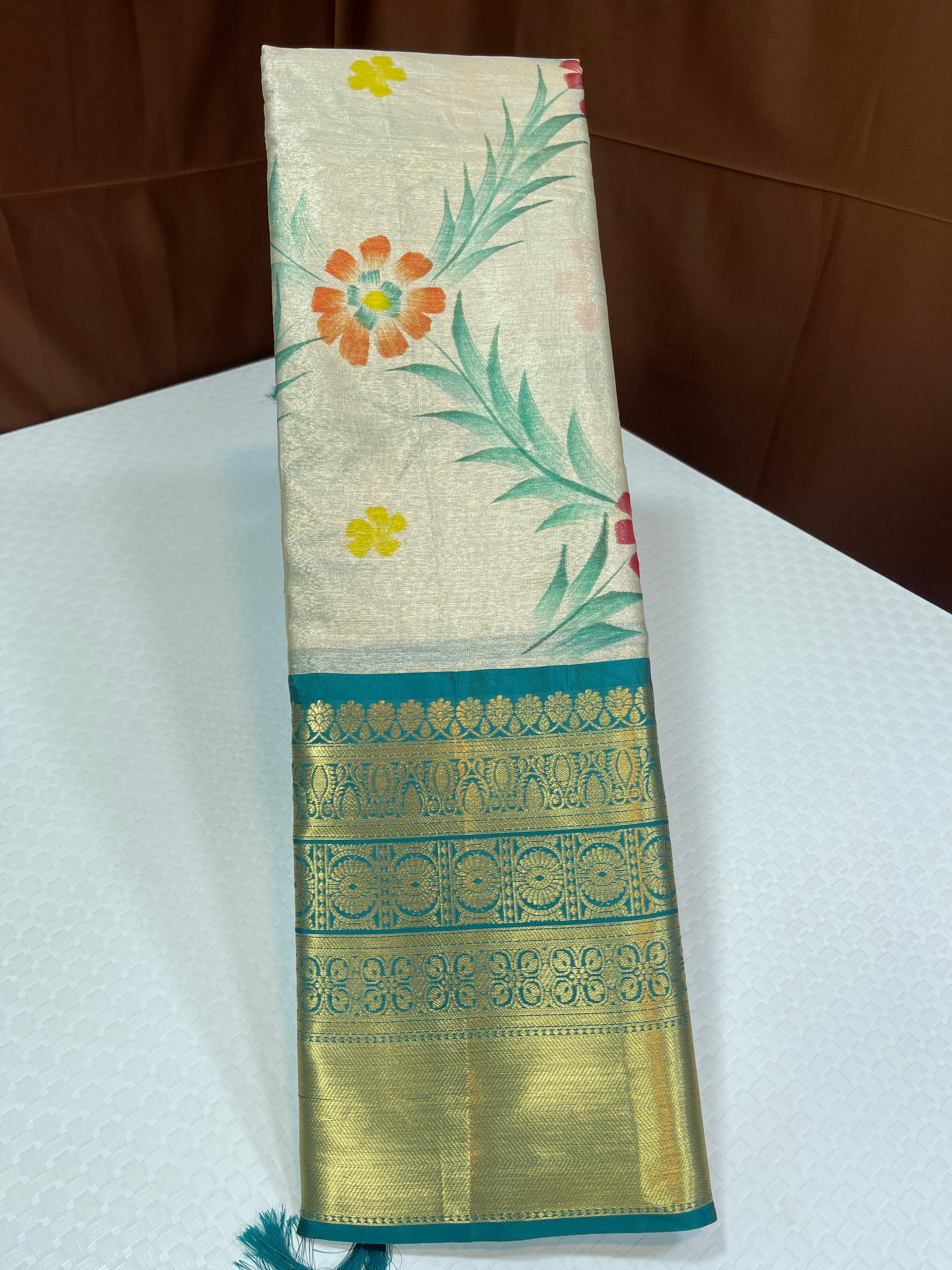 Off white Tissue Silk Floral Handpainted Jaal Contrast Dark Green Border Banarasi Saree MS_TS27