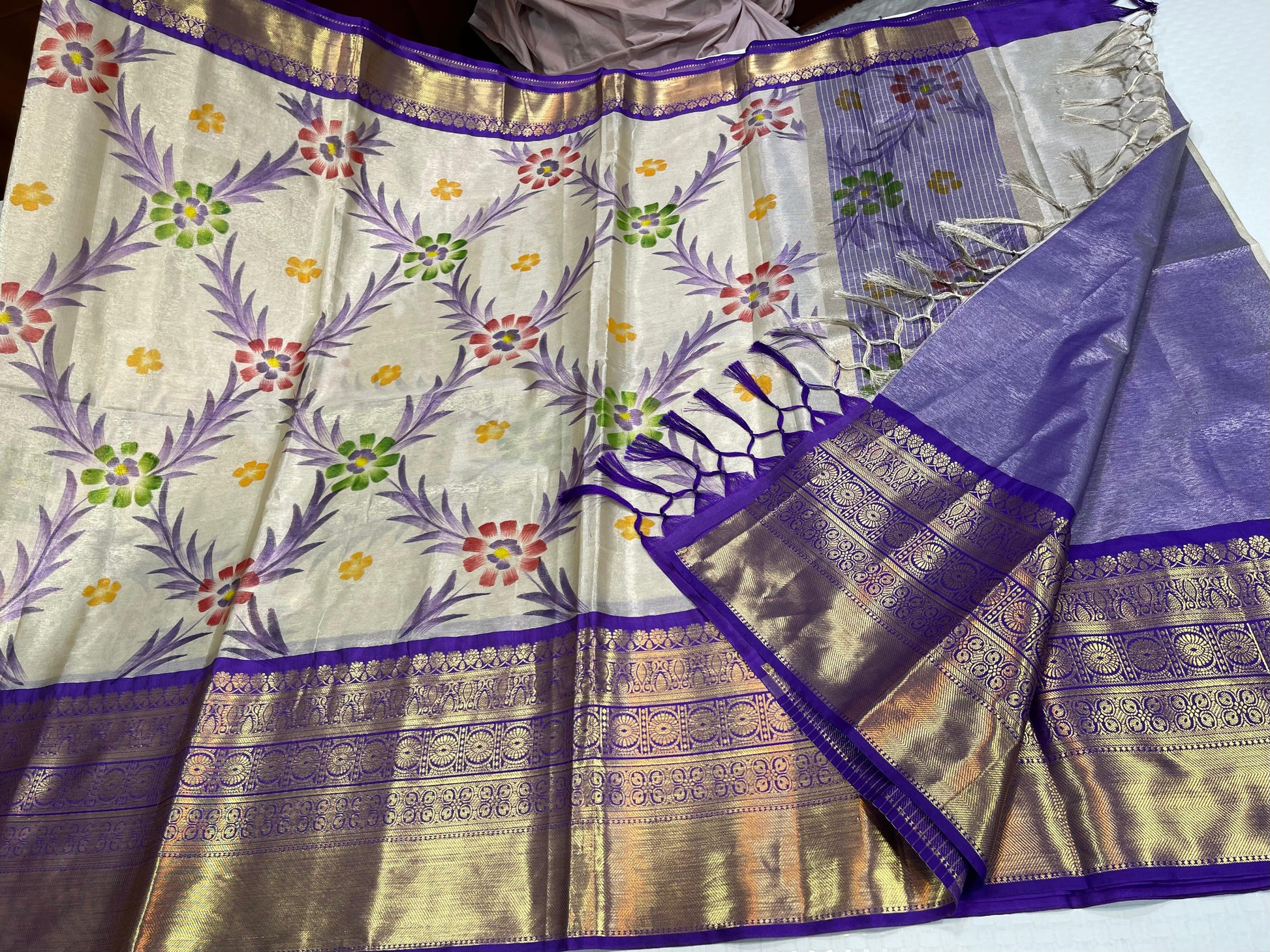 Off white Tissue Silk Floral Handpainted Jaal Contrast Indigo Blue Border Banarasi Saree MS_TS26