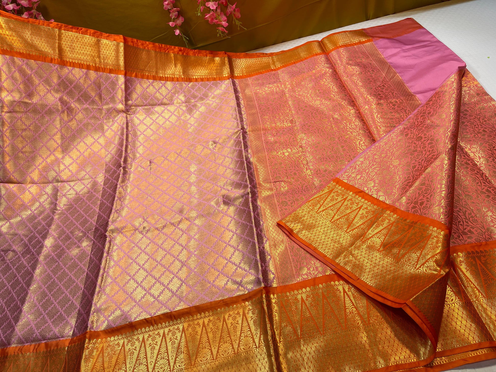 Peach Semi Kanchi Silk Brocade Contrast Orange Border Banarasi Saree MS_SK12