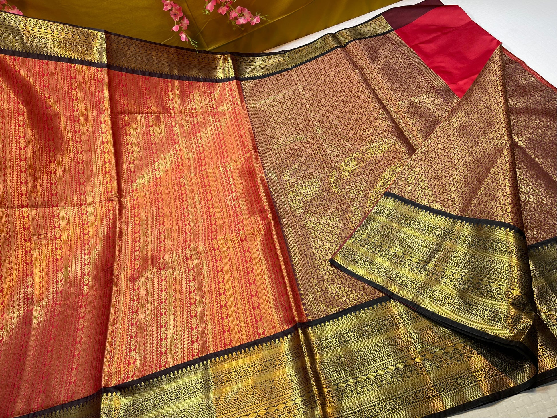 Red Semi Kanchi Silk Stripe Zari Contrast Black Border Banarasi Saree MS_SK44