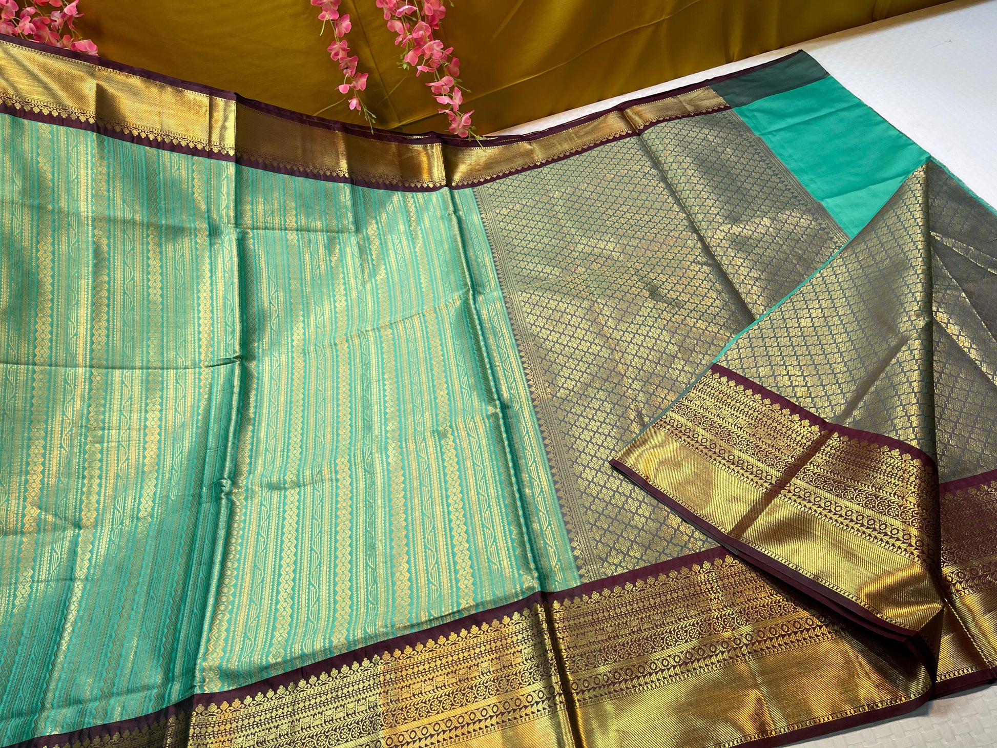 Seagreen Semi Kanchi Silk Stripe Zari Contrast Brown Border Banarasi Saree MS_SK46